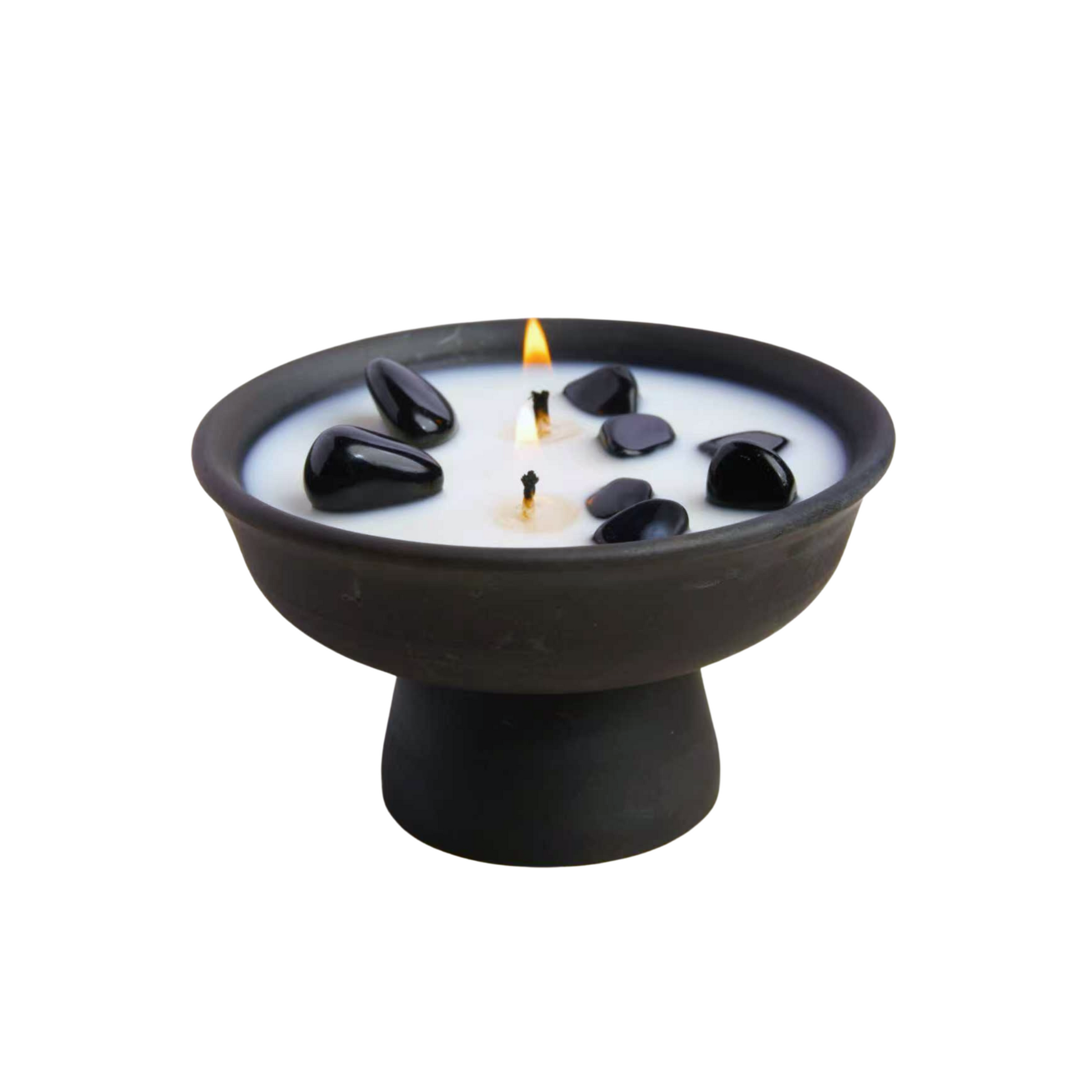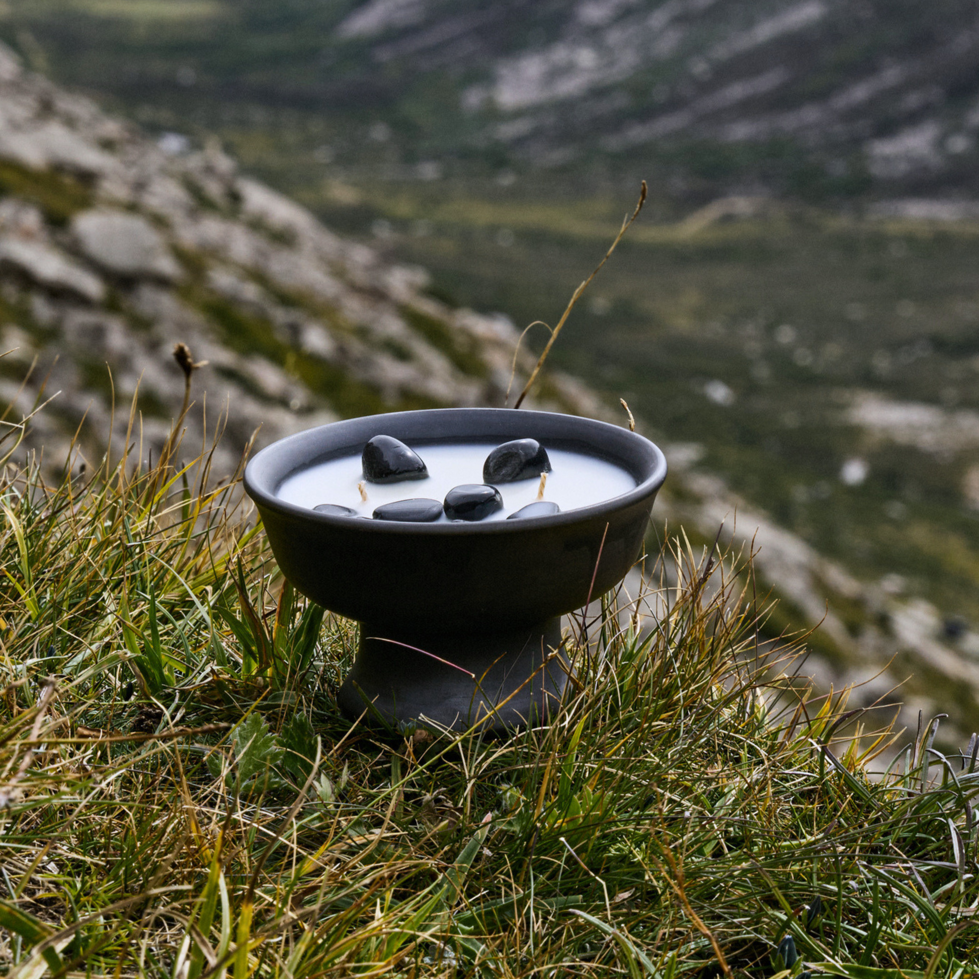 Each vessel is meticulously hand-shaped from high-altitude minority-heritage black clay, then slow-fired to reveal its deep charcoal sheen. Inside, natural soy wax mingles with shimmering black obsidian, creating a pure, long-lasting aromatic burn. Hidden on the inner wall is a finely embossed Tibetan God of Wealth emblem, a quiet symbol of abundance.